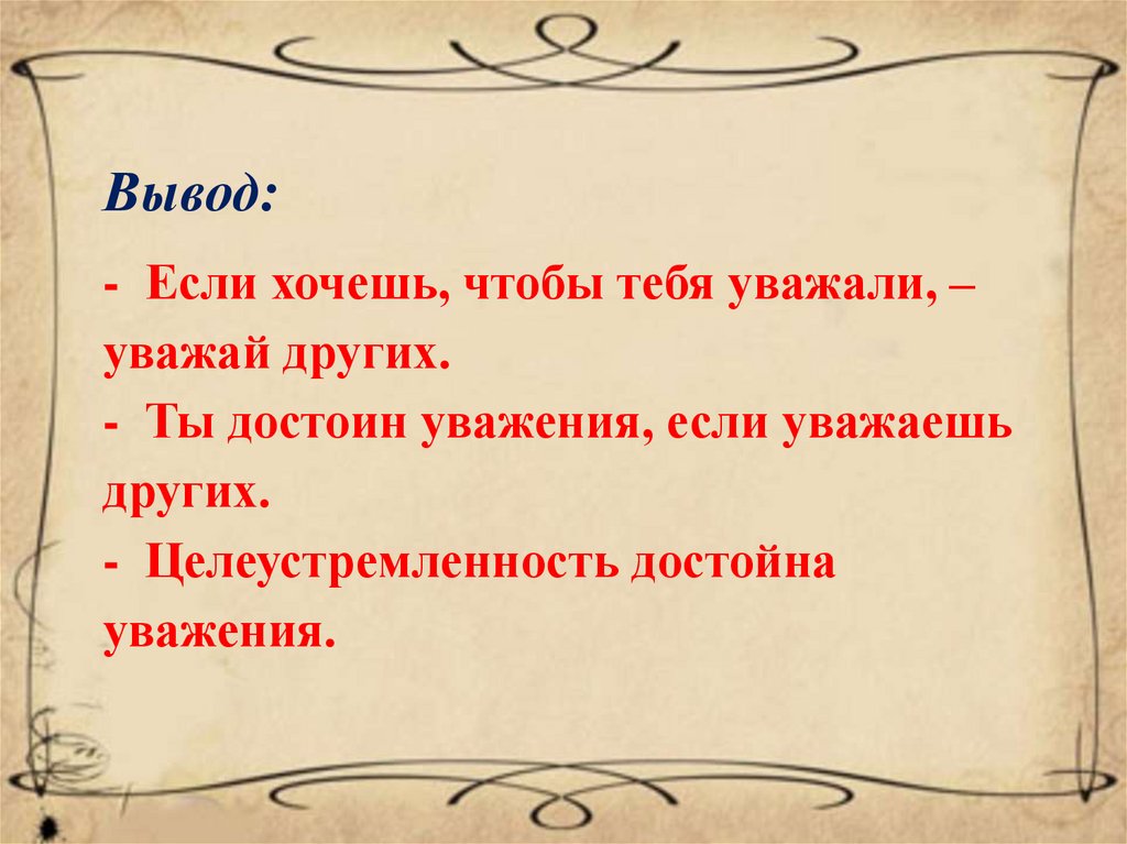 Вывод:- Если хочешь, чтобы тебя уважали, –