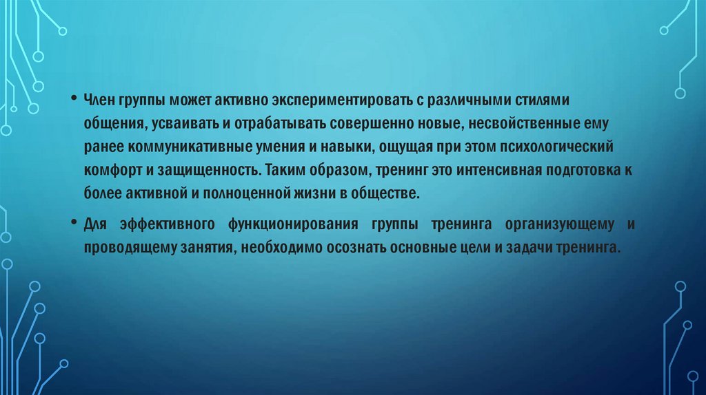 • Член группы может активно экспериментировать с различными стилямиобщения, усваивать и отрабатывать совершенно новые, несвойственные ему