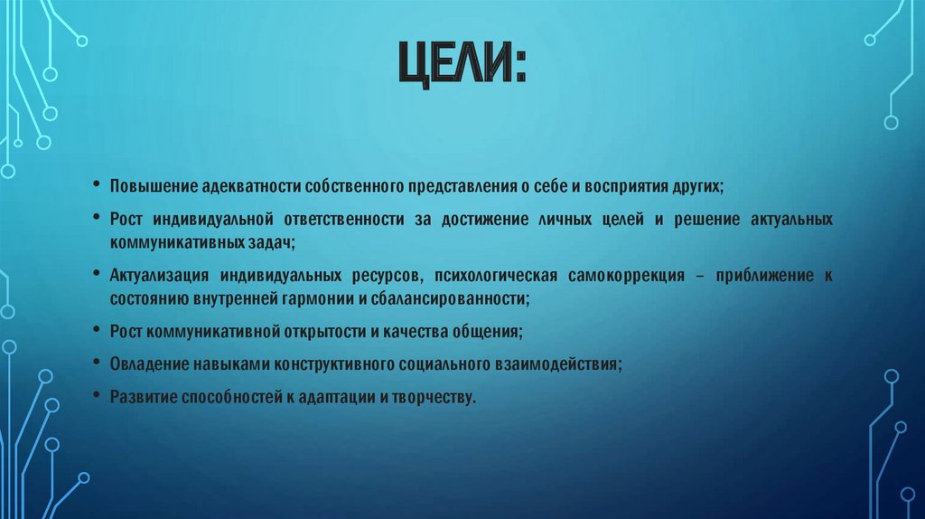 ЦЕЛИ:• Повышение адекватности собственного представления о себе и восприятия других;