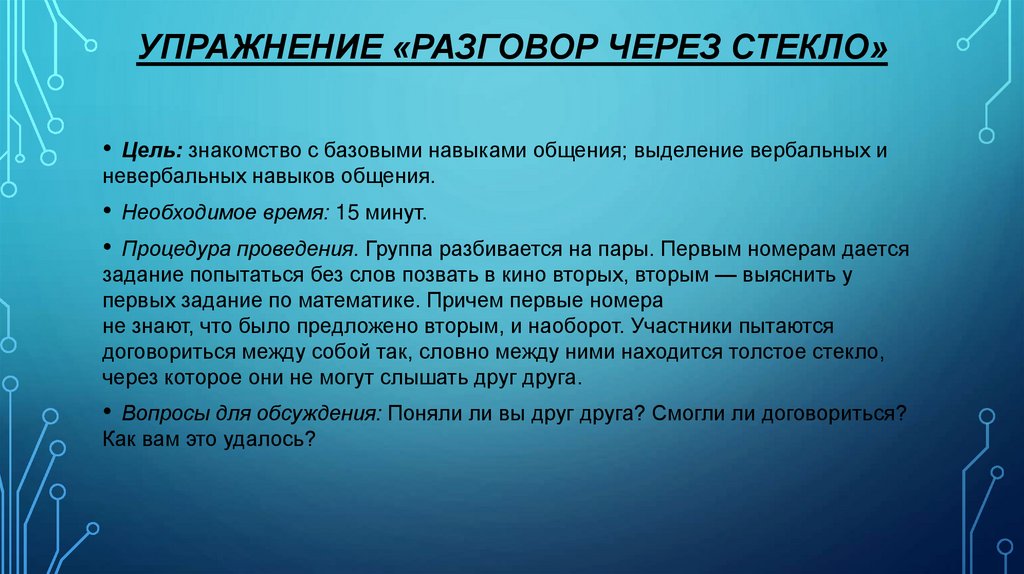УПРАЖНЕНИЕ «РАЗГОВОР ЧЕРЕЗ СТЕКЛО»• Цель: знакомство с базовыми навыками общения; выделение вербальных и