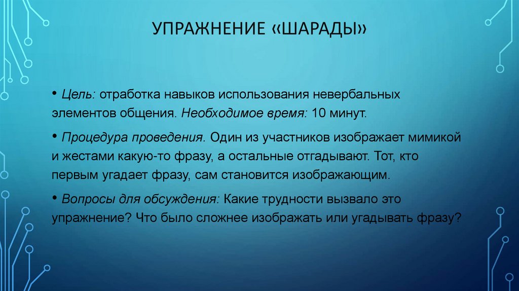УПРАЖНЕНИЕ «ШАРАДЫ»• Цель: отработка навыков использования невербальных
