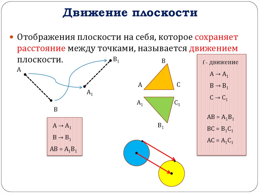 Движение плоскостиОтображения плоскости на себя, которое сохраняет