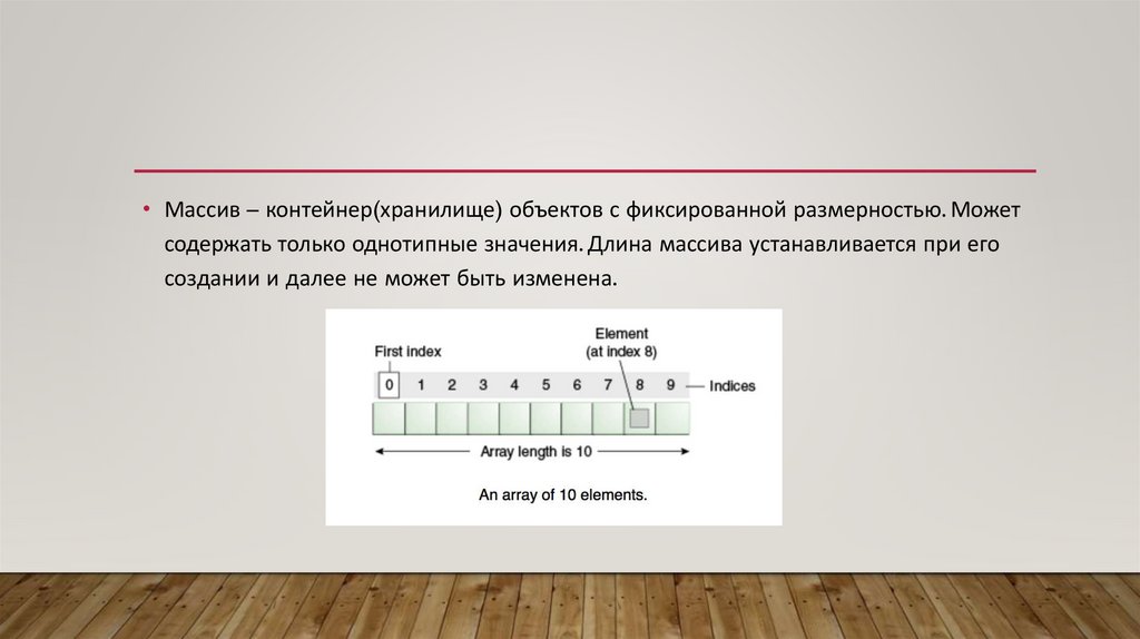 • Массив – контейнер(хранилище) объектов с фиксированной размерностью. Можетсодержать только однотипные значения. Длина массива устанавливается при его