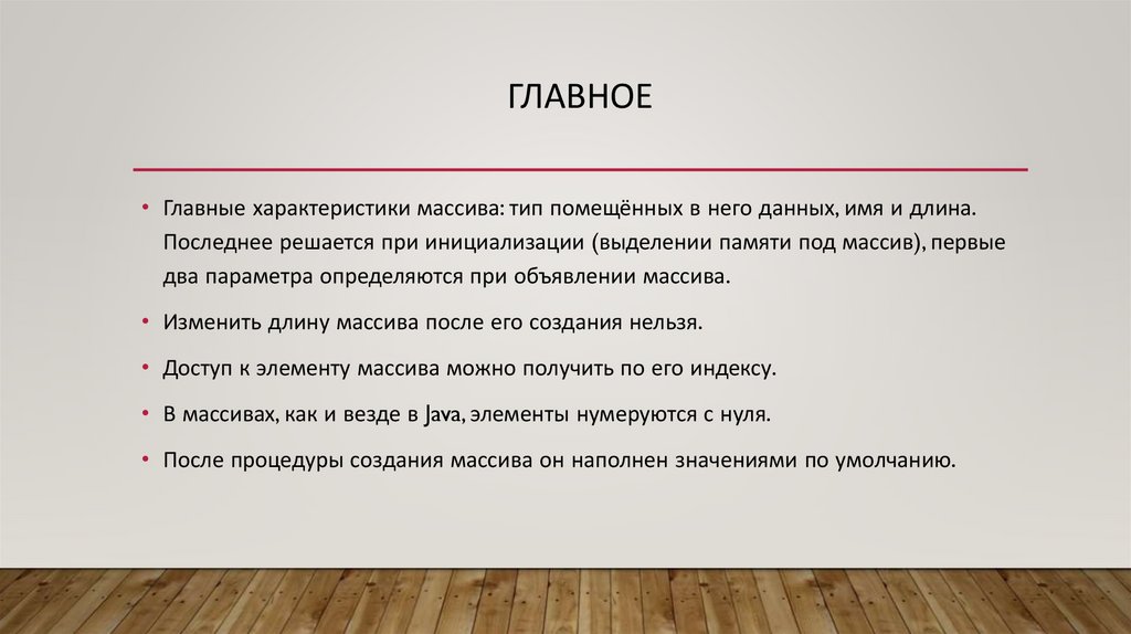 ГЛАВНОЕ• Главные характеристики массива: тип помещённых в него данных, имя и длина.