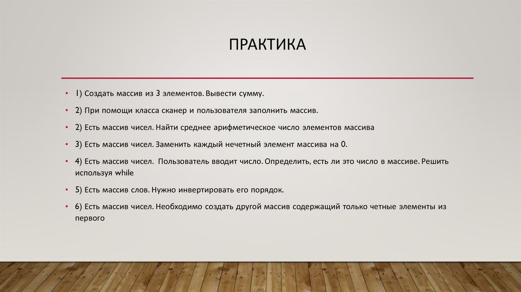 ПРАКТИКА• 1) Создать массив из 3 элементов. Вывести сумму.