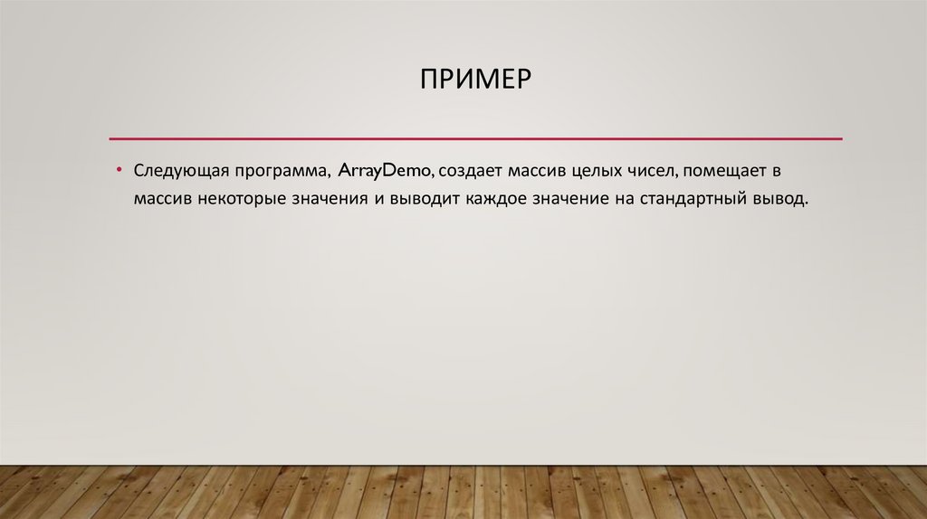 ПРИМЕР• Следующая программа, ArrayDemo, создает массив целых чисел, помещает в