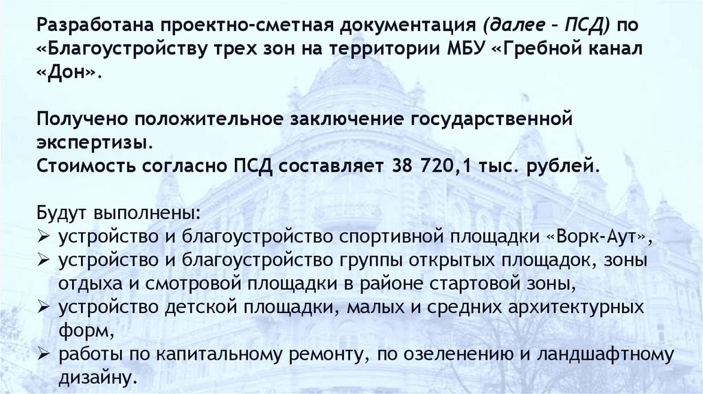 Разработана проектно-сметная документация (далее – ПСД) по«Благоустройству трех зон на территории МБУ «Гребной канал