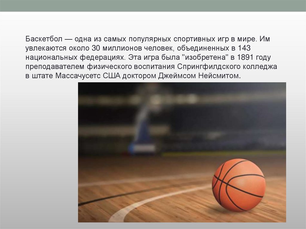 Баскетбол — одна из самых популярных спортивных игр в мире. Имувлекаются около 30 миллионов человек, объединенных в 143