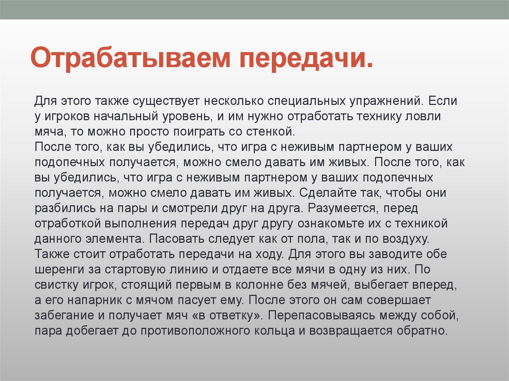 Отрабатываем передачи.Для этого также существует несколько специальных упражнений. Если