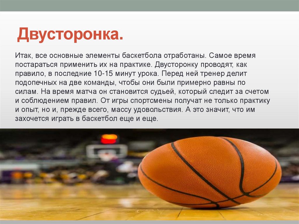 Двусторонка.Итак, все основные элементы баскетбола отработаны. Самое время
