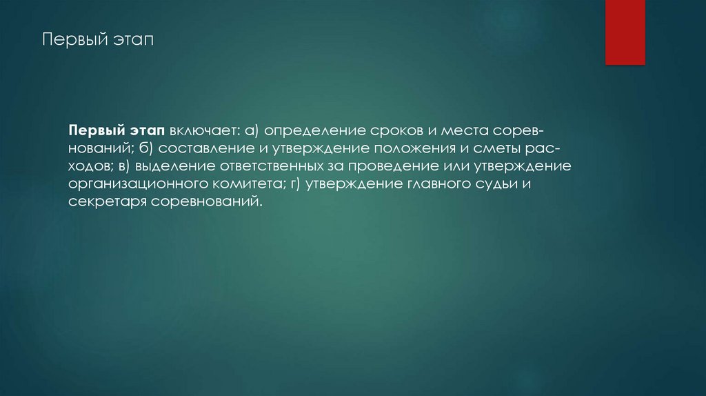 Первый этапПервый этап включает: а) определение сроков и места соревнований; б) составление и утверждение положения и сметы расходов; в) выделение ответственных за проведение или утверждение