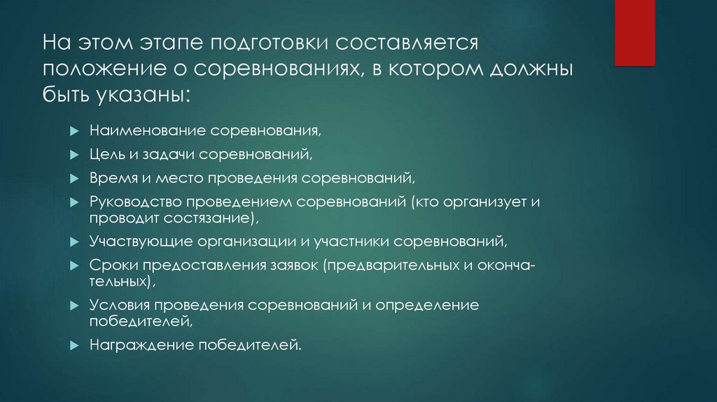 На этом этапе подготовки составляетсяположение о соревнованиях, в котором должны