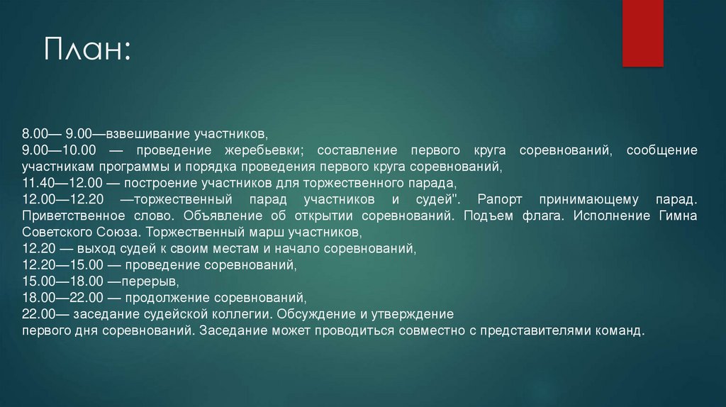 План:8.00— 9.00—взвешивание участников,