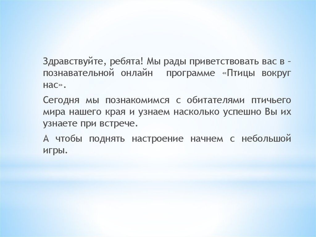 Здравствуйте, ребята! Мы рады приветствовать вас в –познавательной онлайн программе «Птицы вокруг