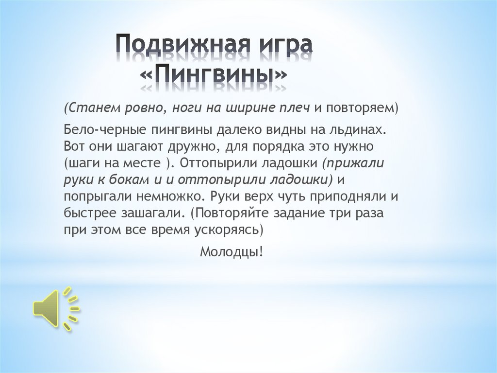 (Станем ровно, ноги на ширине плеч и повторяем)Бело-черные пингвины далеко видны на льдинах.
