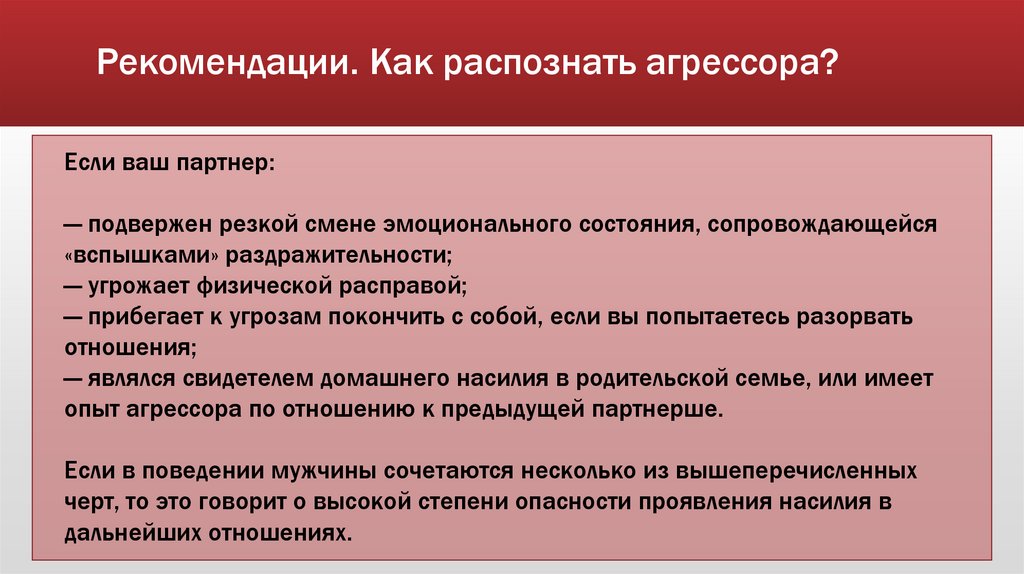 Рекомендации. Как распознать агрессора?Если ваш партнер: