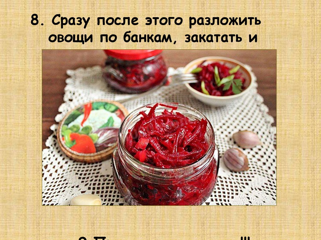 8. Сразу после этого разложитьовощи по банкам, закатать и
