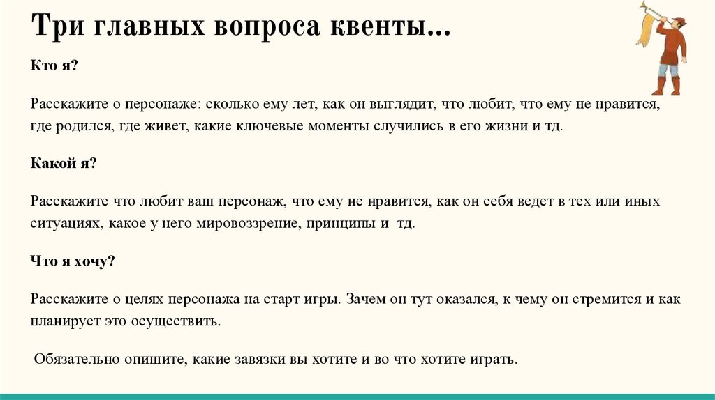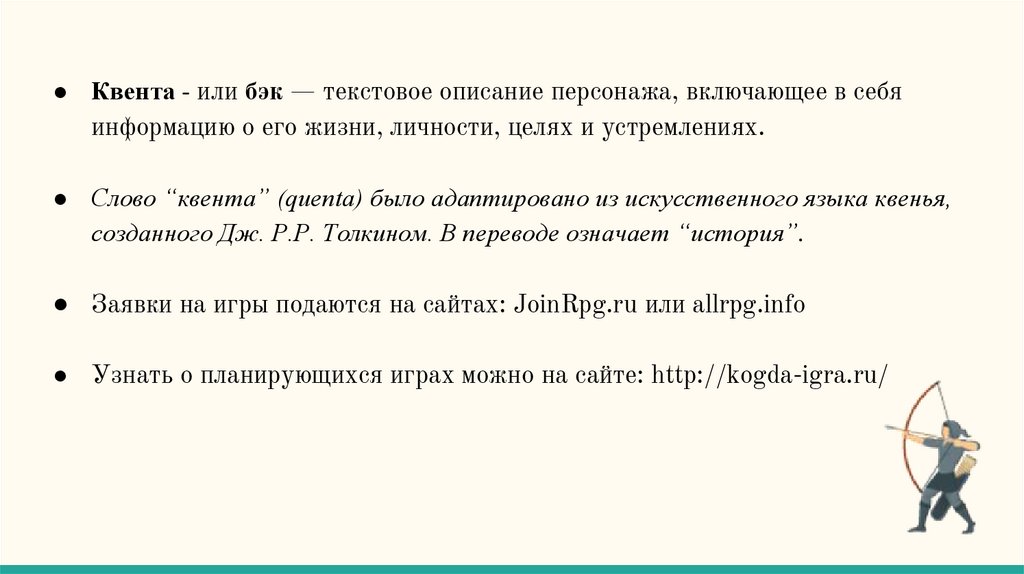 ● Квента - или бэк — текстовое описание персонажа, включающее в себяинформацию о его жизни, личности, целях и устремлениях.