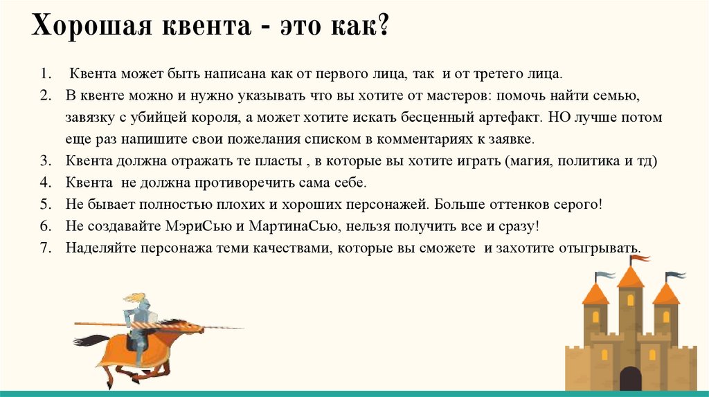 3. Квента должна отражать те пласты , в которые вы хотите играть (магия, политика и тд)