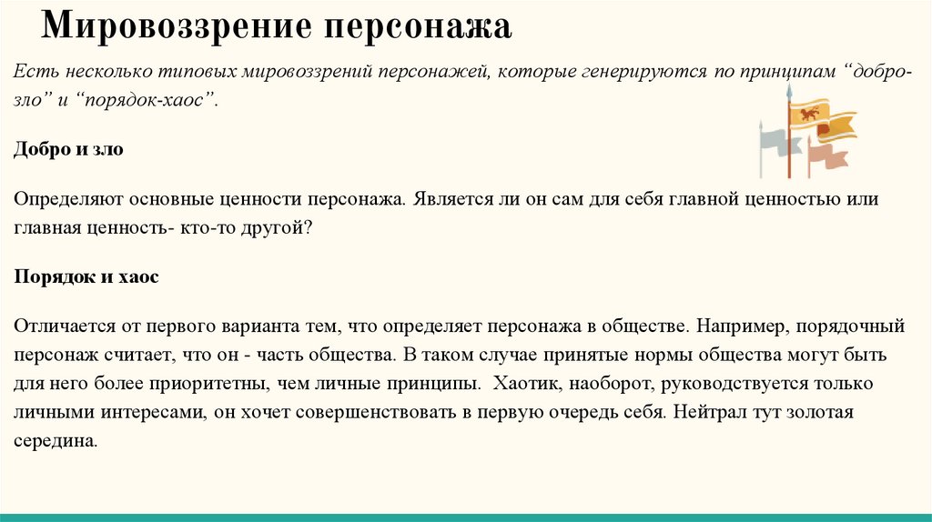 Мировоззрение персонажаЕсть несколько типовых мировоззрений персонажей, которые генерируются по принципам “доброзло” и “порядок-хаос”.