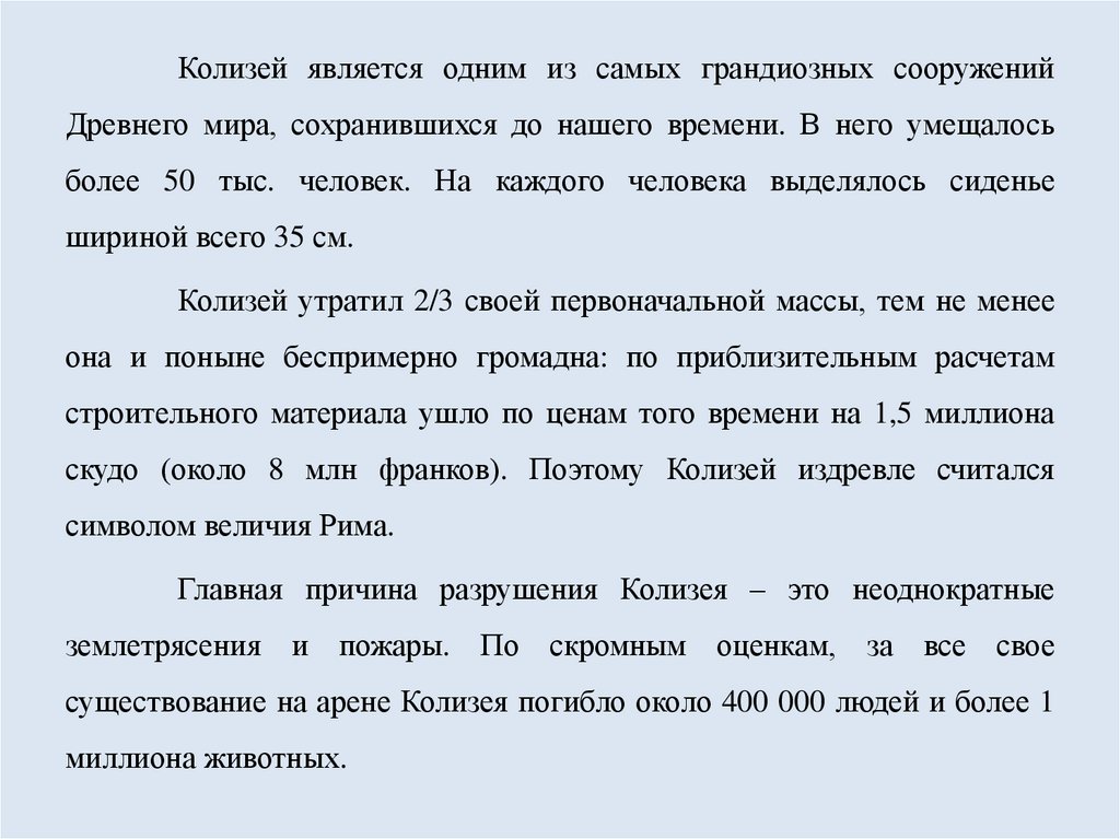 Колизей является одним из самых грандиозных сооруженийДревнего мира, сохранившихся до нашего времени. В него умещалось