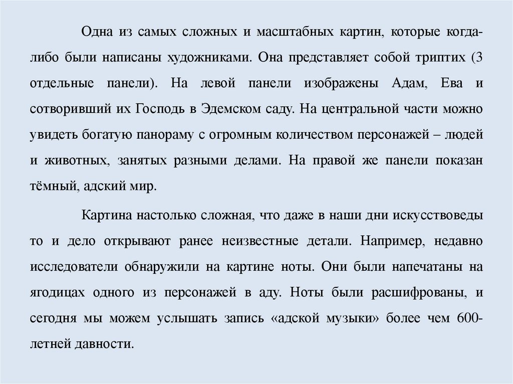 Одна из самых сложных и масштабных картин, которые когдалибо были написаны художниками. Она представляет собой триптих (3отдельные панели). На левой панели изображены Адам, Ева и