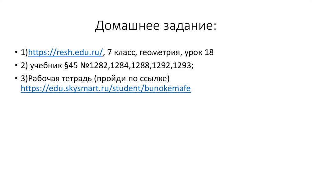 Домашнее задание:• 1)https://resh.edu.ru/, 7 класс, геометрия, урок 18