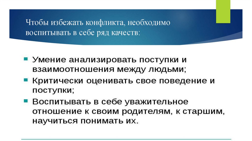 Чтобы избежать конфликта, необходимовоспитывать в себе ряд качеств: