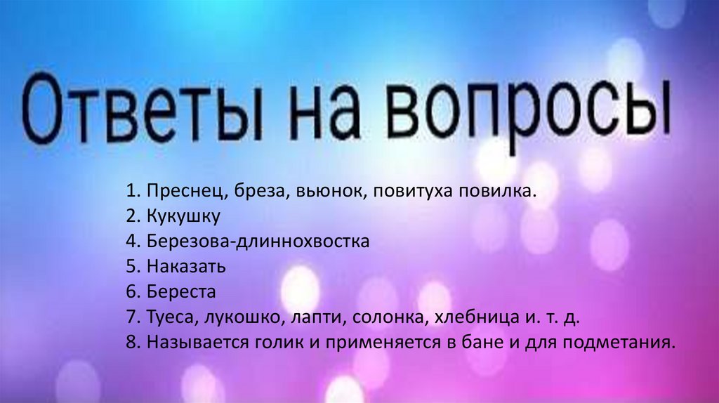 1. Преснец, бреза, вьюнок, повитуха повилка.2. Кукушку