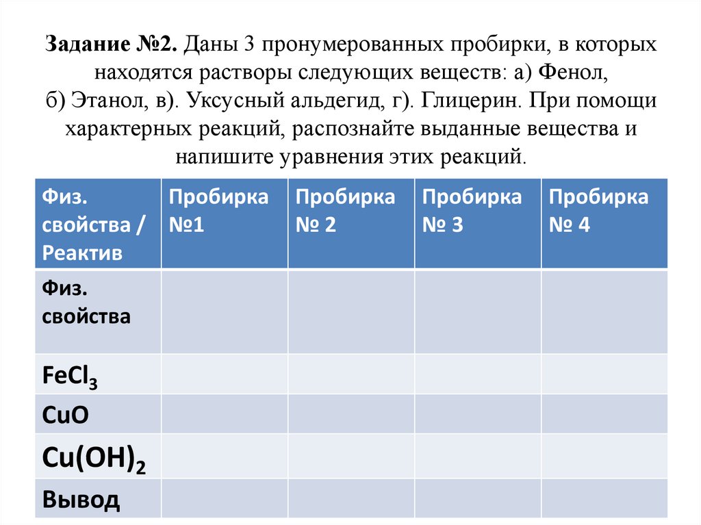 Задание №2. Даны 3 пронумерованных пробирки, в которыхнаходятся растворы следующих веществ: а) Фенол,