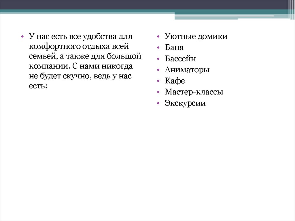 • У нас есть все удобства длякомфортного отдыха всей