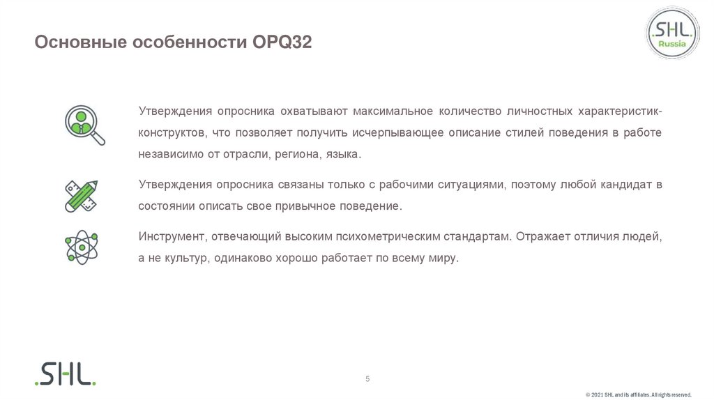 Основные особенности OPQ32Утверждения опросника охватывают максимальное количество личностных характеристикконструктов, что позволяет получить исчерпывающее описание стилей поведения в работе