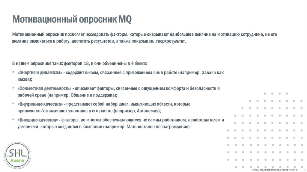 Мотивационный опросник MQМотивационный опросник позволяет исследовать факторы, которые оказывают наибольшее влияние на мотивацию сотрудника, на его