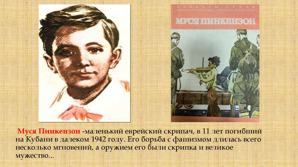 Муся Пинкензон -маленький еврейский скрипач, в 11 лет погибшийна Кубани в далеком 1942 году. Его борьба с фашизмом длилась всего