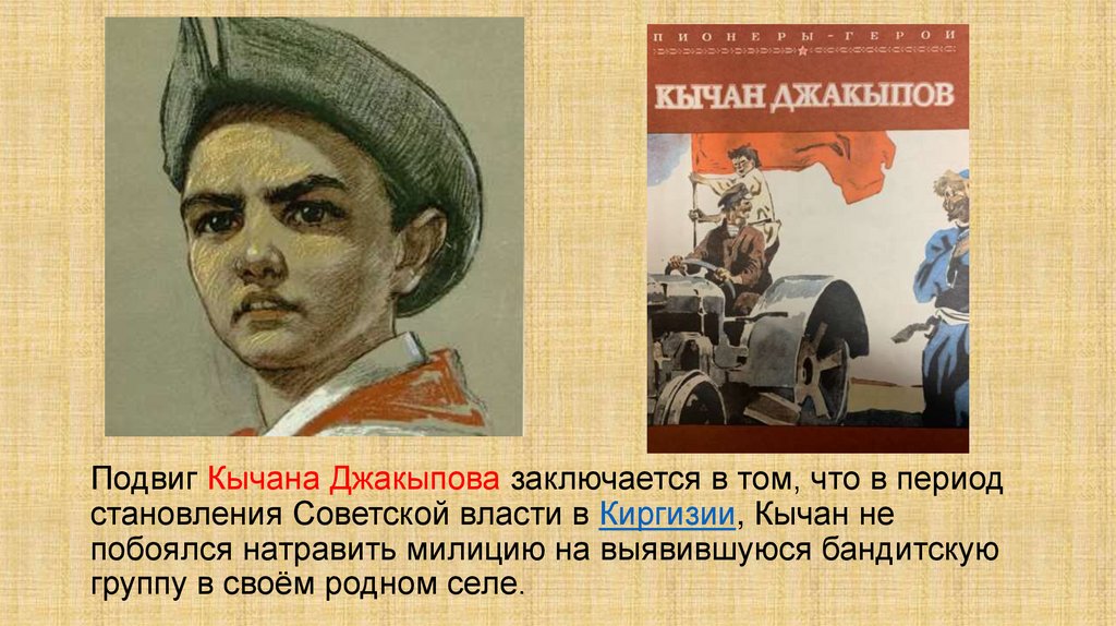 Подвиг Кычана Джакыпова заключается в том, что в периодстановления Советской власти в Киргизии, Кычан не