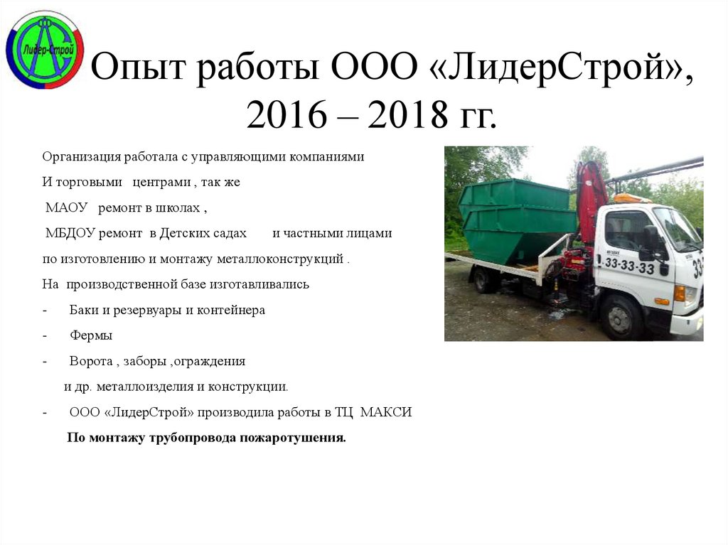 Опыт работы ООО «ЛидерСтрой»,2016 – 2018 гг.