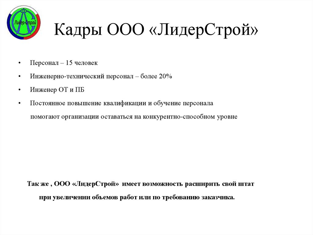 Так же , ООО «ЛидерСтрой» имеет возможность расширить свой штат
