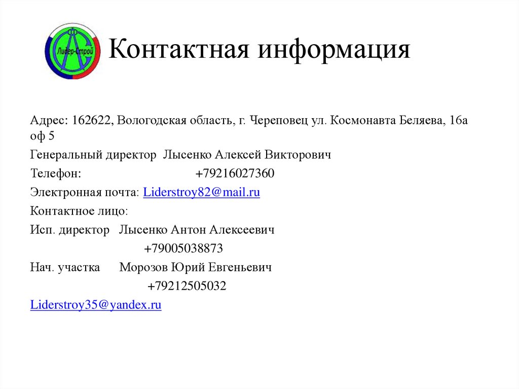 Электронная почта: Liderstroy82@mail.ru