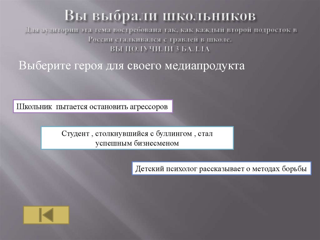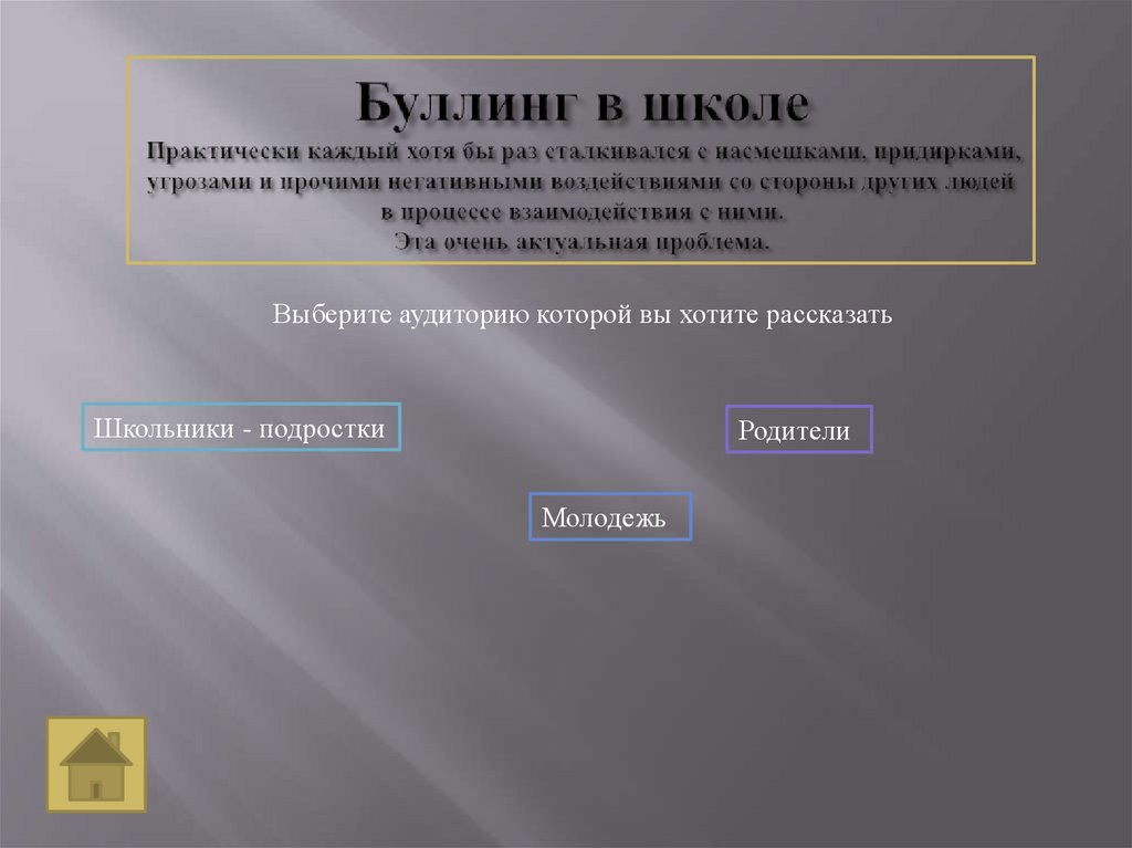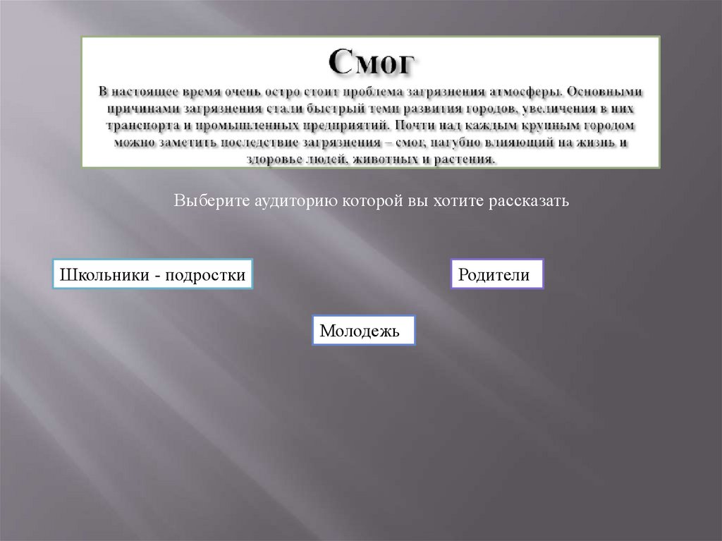 Выберите аудиторию которой вы хотите рассказатьШкольники - подростки