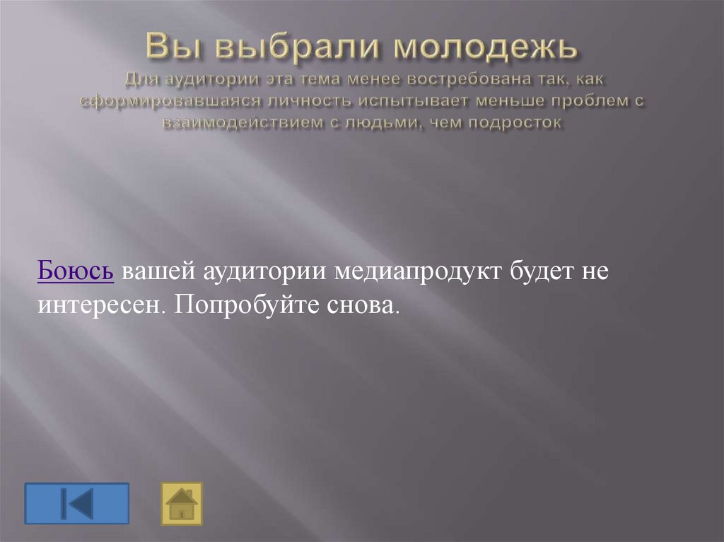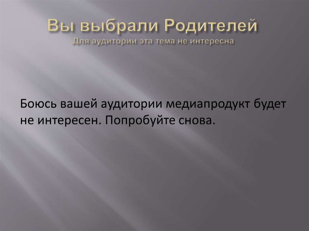 Боюсь вашей аудитории медиапродукт будет неинтересен. Попробуйте снова.