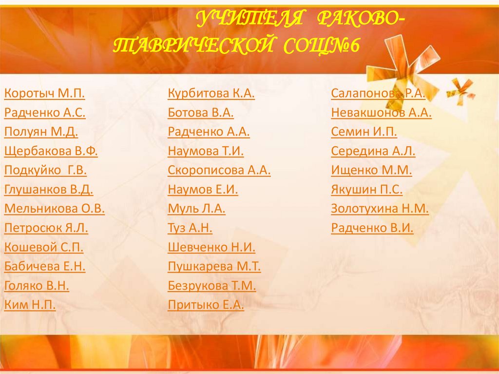 УЧИТЕЛЯ РАКОВОТАВРИЧЕСКОЙ СОЩ№6Коротыч М.П.