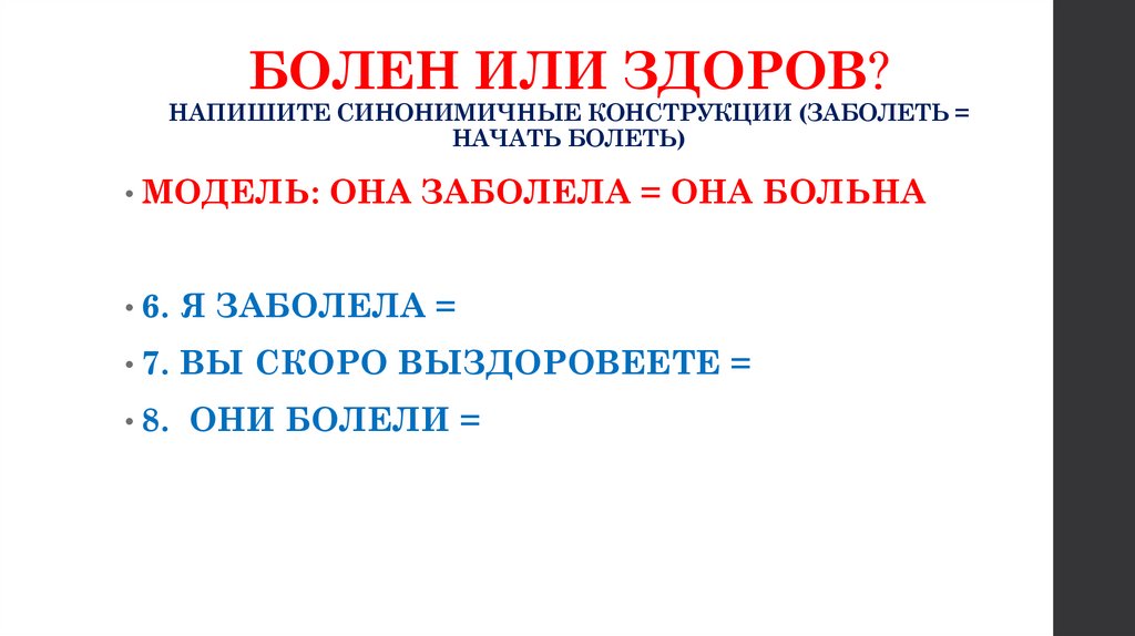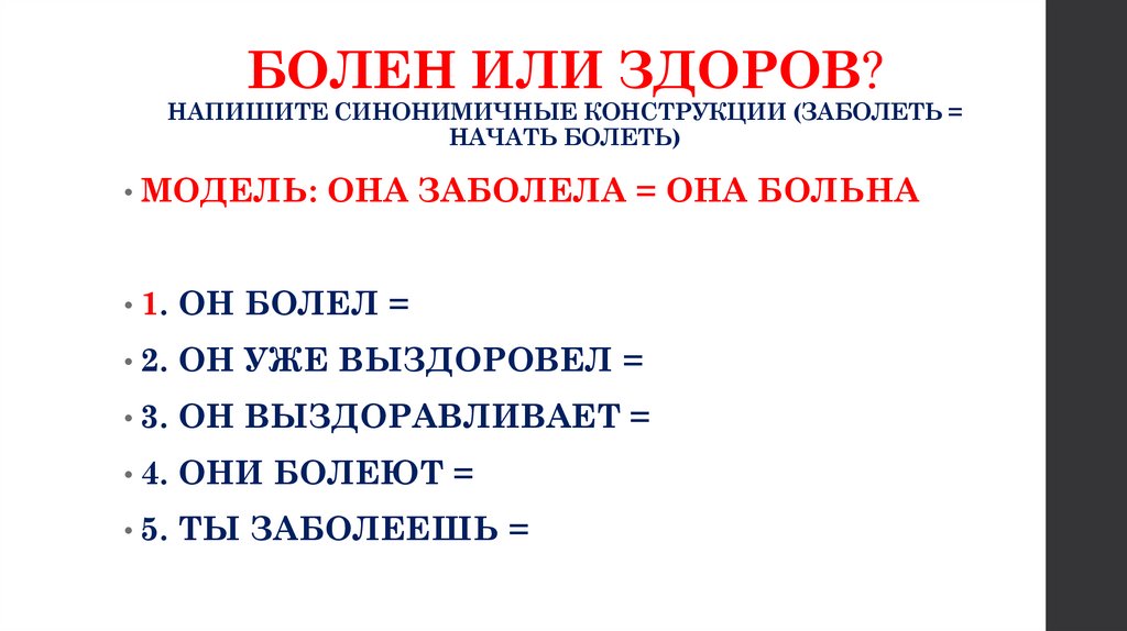 БОЛЕН ИЛИ ЗДОРОВ?НАПИШИТЕ СИНОНИМИЧНЫЕ КОНСТРУКЦИИ (ЗАБОЛЕТЬ =