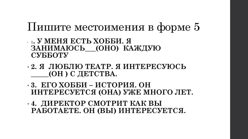 Пишите местоимения в форме 5. У МЕНЯ ЕСТЬ ХОББИ. Я