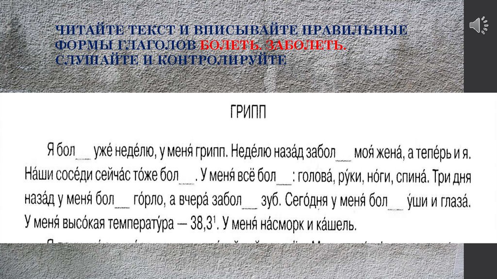 ЧИТАЙТЕ ТЕКСТ И ВПИСЫВАЙТЕ ПРАВИЛЬНЫЕФОРМЫ ГЛАГОЛОВ БОЛЕТЬ. ЗАБОЛЕТЬ.