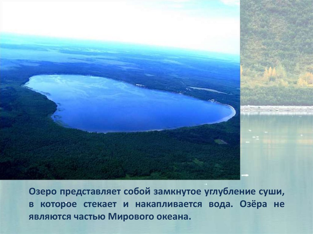 Озеро представляет собой замкнутое углубление суши,в которое стекает и накапливается вода. Озёра не