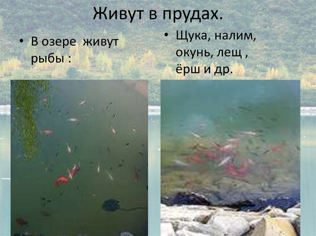 Живут в прудах.• В озере живут