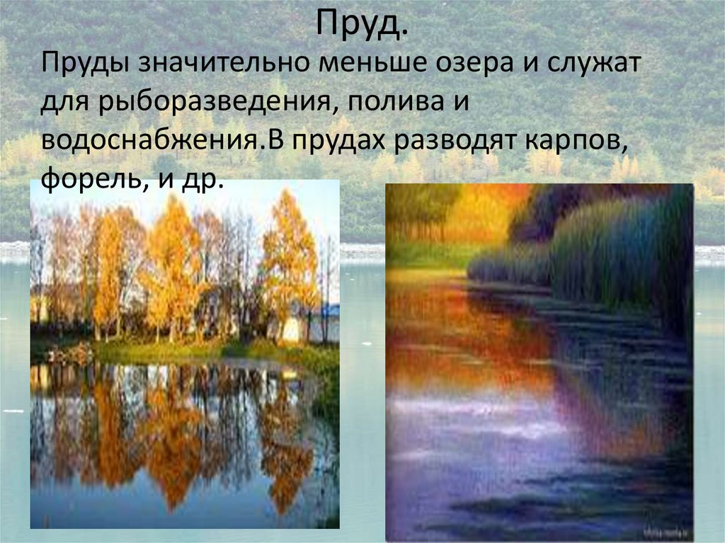 Пруд.Пруды значительно меньше озера и служат