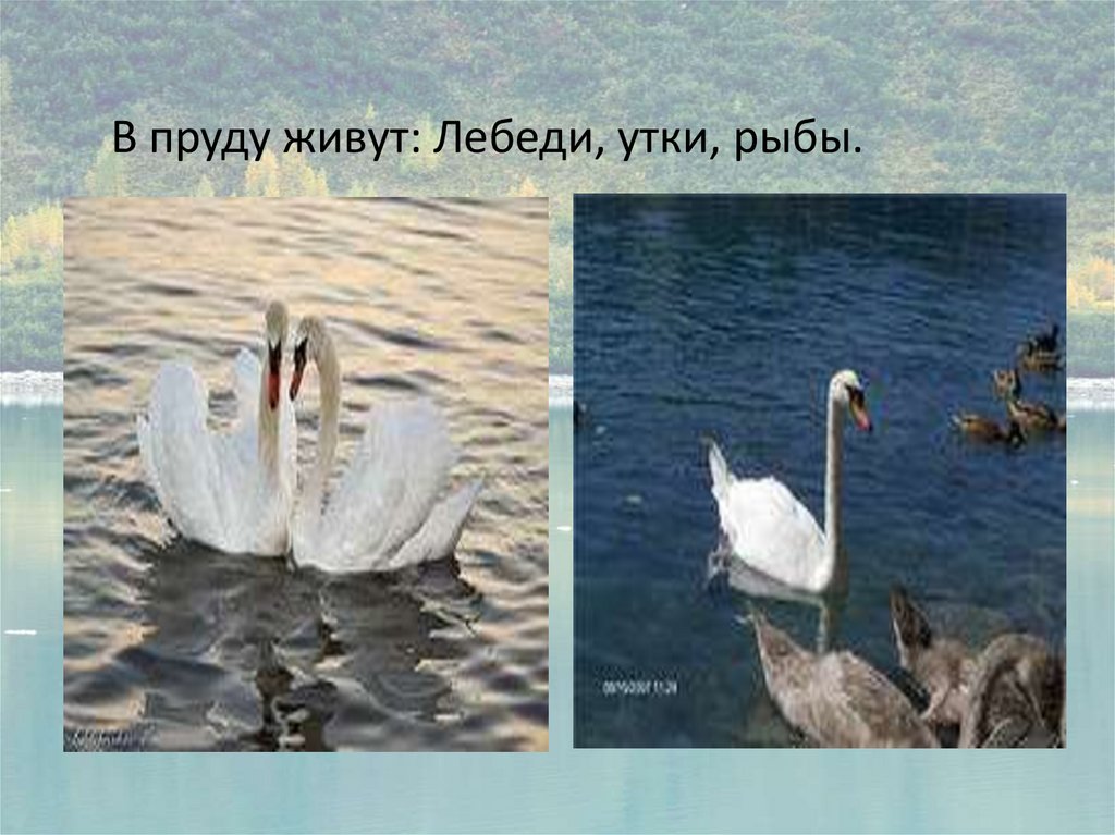 В пруду живут: Лебеди, утки, рыбы.6.