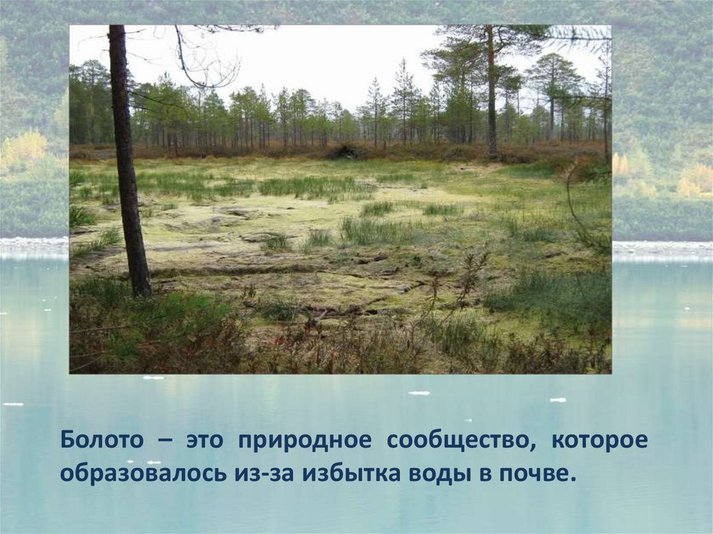 Болото – это природное сообщество, котороеобразовалось из-за избытка воды в почве.