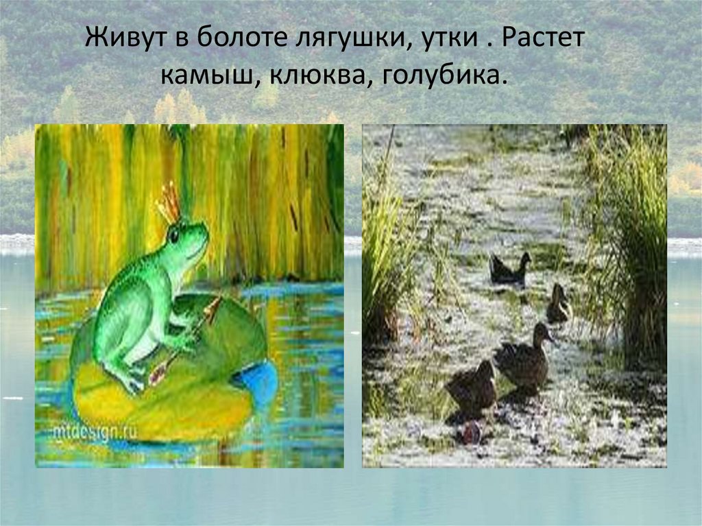 Живут в болоте лягушки, утки . Растеткамыш, клюква, голубика.